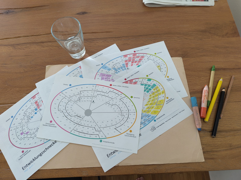 Um die Fortschritte der Kinder in den unterschiedlichsten Entwicklungsbereichen gut darzustellen benutze ich die sogenannte Entwicklungsschnecke. An ihr wird sehr schön Sichtbar wo die Stärken und Schwächen des jeweiligen Kindes liegen. Sie dient beim Austausch als Grundlage.